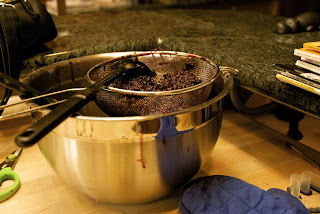 Straining blackberries for the Blackberry-Thyme Margaritas