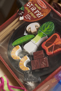 Wooden Asian Cooking set by Melissa and Doug – complete with chopsticks and a wok (the wok and the veggies have velcro on them…BRILLIANT)