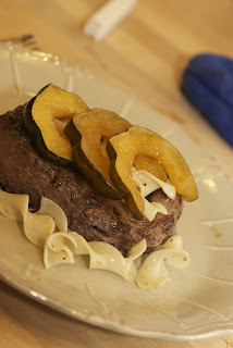 Steak with Provolone and Spinach on top of Buttered Egg Noodles and
