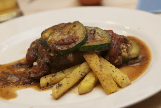 often do to relieve stress. I cooked. Since it was just me and the bear, I chose a rather simple recipe that was easy to adjust for only one person (plus a tiny munchkin): Steak and Veggies with a wine sauce. I sautéed some polenta, and there we had it, a delicious meal and tension dissolver in one! The zucchini, tomatoes and onion were from the garden.