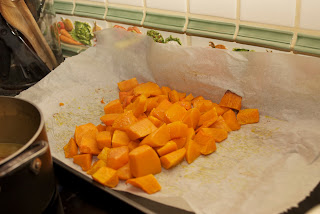 3. Using a large spoon, remove squash from skin, and add to pot (if using cubes, just dump them right on in after removing them from the oven). Add coriander, cumin and basil.