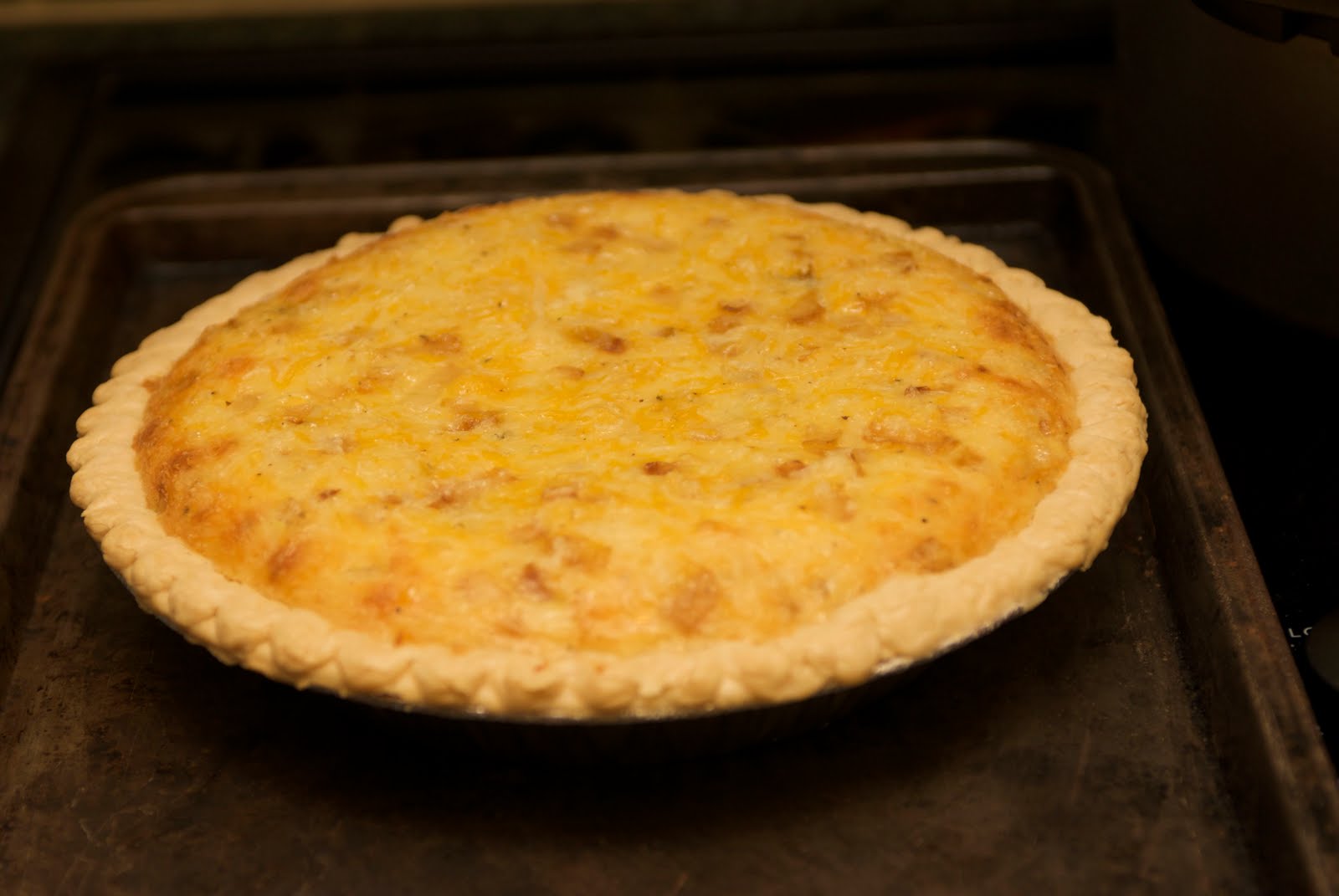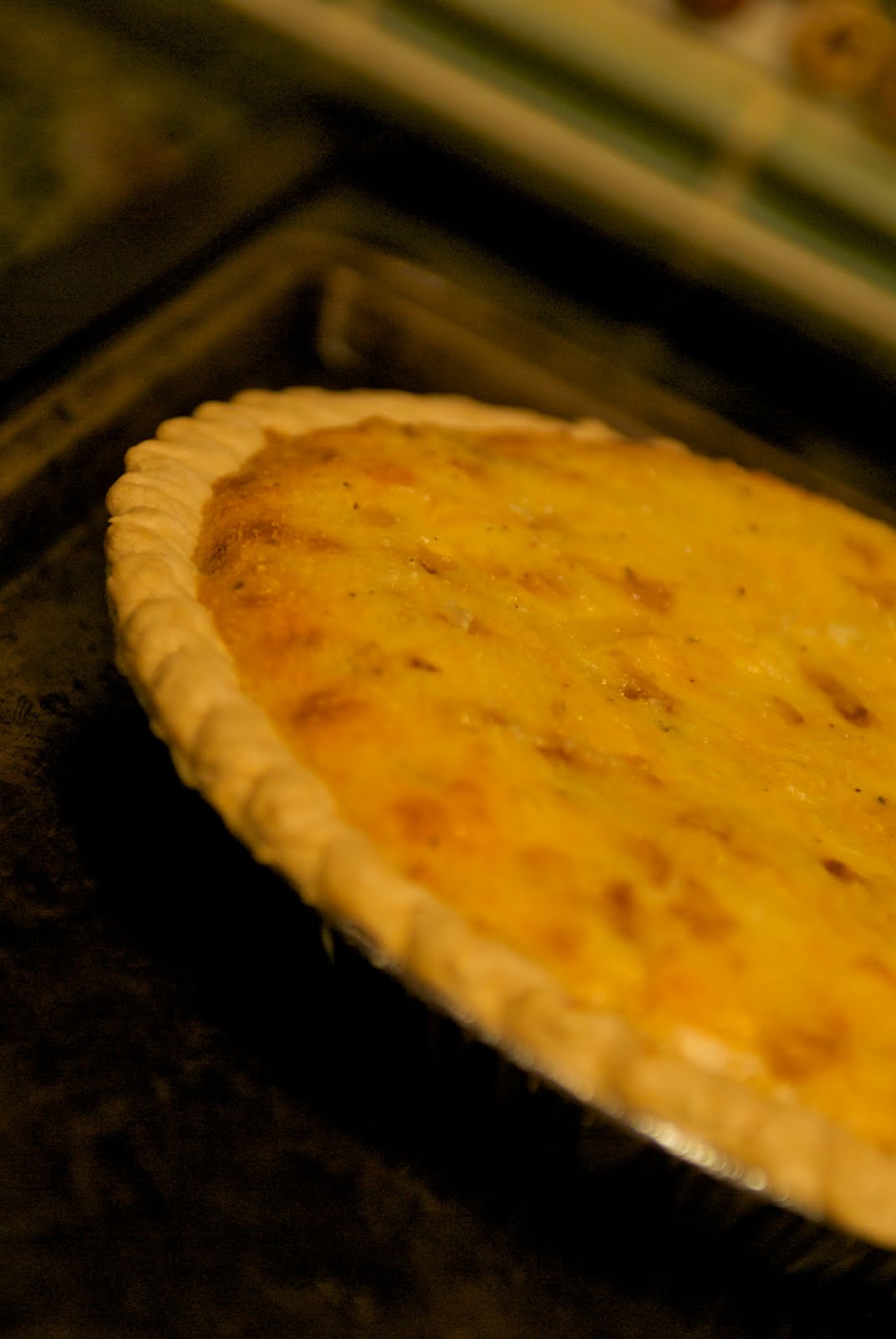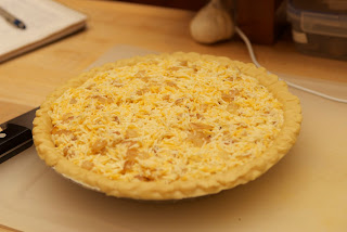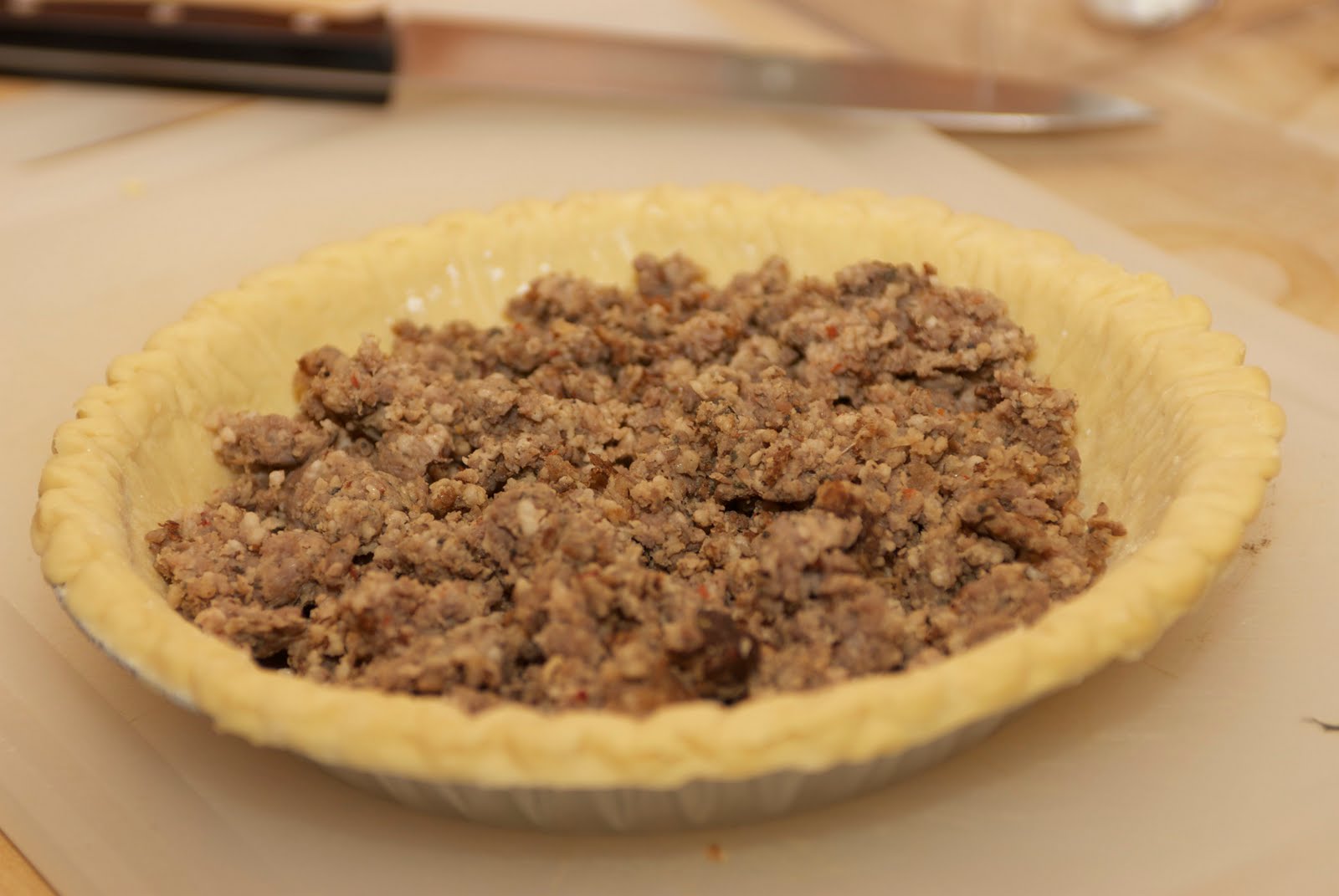 5. Place sausage in bottom of pie crust, and top with dairy mixture.