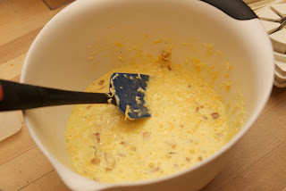 4. Mix together ranch dressing, milk, and eggs. Add cooled onion, cheese, sugar, salt, pepper, and hot sauce.