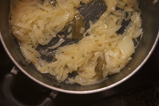 1. Melt butter in a large pot over medium heat. Set aside 1 – 2 cups onions. Add bay leaves and remaining onions to pan, stir to coat with butter. Cover and cook on low stirring occasionally until very tender but not browned (about 30 minutes).