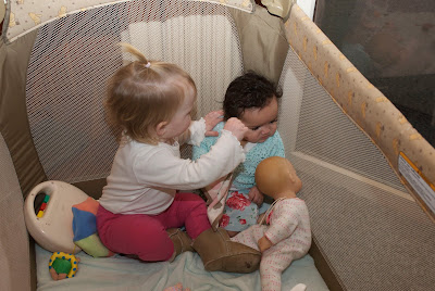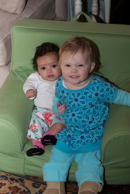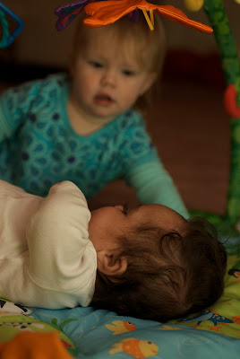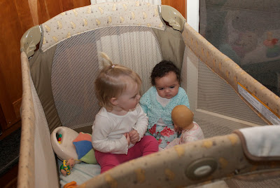 Having the cousins meet was lots of fun. Ellie Graye didn’t know what to do with the fact that there was a baby in the house. She wanted to be as close to the baby as possible at all times. She kept saying, “Baby! Baby!” She really was sweet and loving and shared all her toys remarkably well. She just didn’t understand why Baby Sydney didn’t want her ducks! The cuteness was just all over the place, so pardon me while I do a little bragging via photos about the next generation of Crazy Cousins!