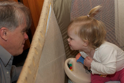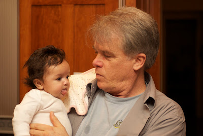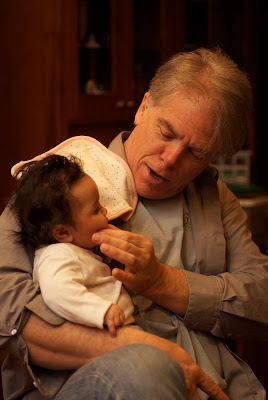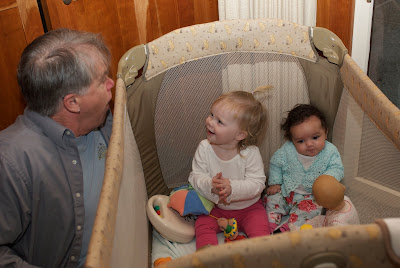 Obviously, I haven’t written anything for several days. My father was in town until this morning (again, it feels like he was here months ago, not hours ago); we had such a fun, relaxing, joyous visit. Ellie Graye quickly got attached to him, calling for Ga-Ga when she woke up in the mornings. I’ve always suspected that Dad would be an awesome grandfather – especially when the kids were old enough to play with (I think he’s like me, he’ll hold and spend time with babies, but it’s the interaction that comes when they’re older that gets fun). He looked awful comfortable with Baby Sydney hanging out in his arms though!