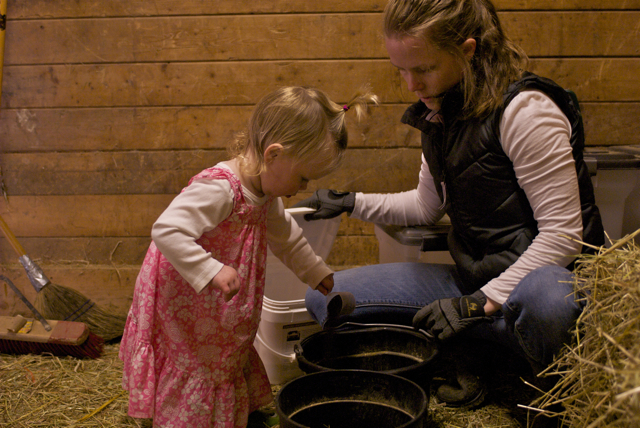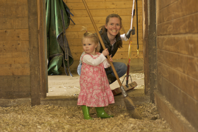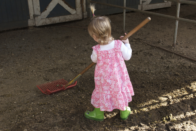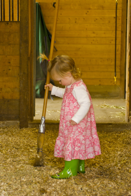 Ellie learned how to clean stalls – and even did so while stylishly wearing a beautiful pink floral dress (I could have used a bit of her style sense when as a teen I was forced to wear dresses this long!). She really loves helping at the barn – and I love watching her! I can’t wait until we can ride together!!!!