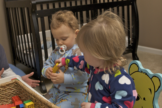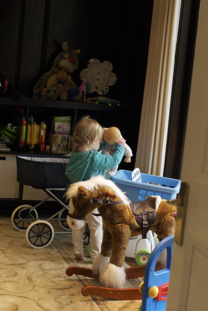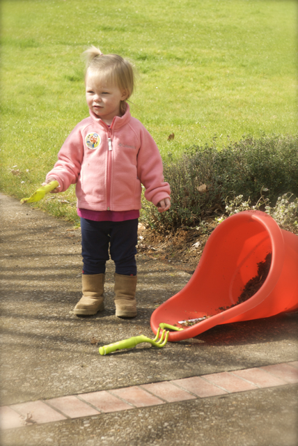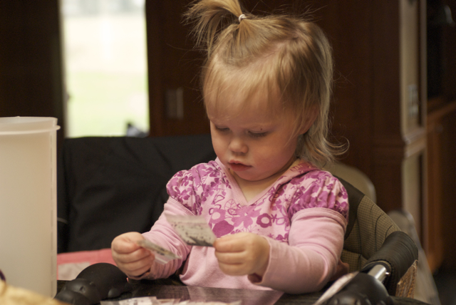 With the sun shining, and no rain threatening to fall, we headed out to take care of the horses. This is, for sure, one of my favorite things to do as a family. Hanging out at the barn, working together, enjoying the animals and the sunshine just makes me want to sing. Yes. Sing. Jeffrey hoists Ellie Graye onto his shoulders and I turn the horses out in the pasture; we watch them play until EG is bored, and then start the walk back to the barn. There’s a drainage creek that runs through the facility, and Ellie loves it. If we’d let her, she’d stay there all day splashing, watching the water as it falls down into the culvert, and throwing rocks into the creek…BUT, the stalls need to be cleaned, feed prepped, and aisles swept. Ellie’s chore is now prepping the grain for the evening and morning feedings. She loves to do it, and does an absolutely fantastic job. Once all the chores are done, EG always requests one last thing: jumping a course……on my hip. She laughs as I run over the trot poles, low jumps and generally huff and puff my way around the arena at a trot. It’s always a good way to end the time with the horses. One day maybe Jeffrey can bring out the camera and get some photos. 🙂