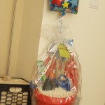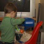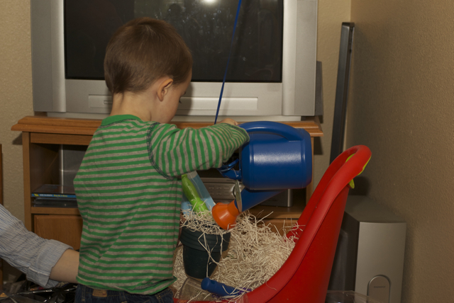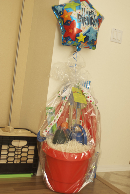 I had a blast putting together his birthday present…I love these kinds of themed gifts! I’ve been collecting stuff for him for several weeks, and once I put it all together, it just looked GREAT! Watering can, shovel, rake, hand rake, hand shovel, planters, and his favorite? The fill! Aaaw, what a cutie!