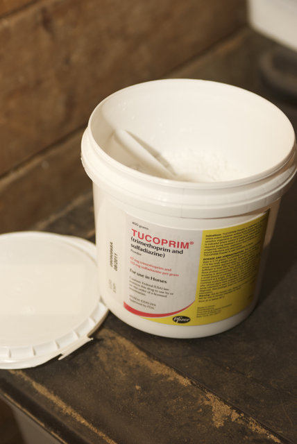 I noticed Frank’s leg was a bit hot and swollen, and was pretty tender. He cut himself two weeks ago, and had had a little infection when Gioia was here. She had done a Fura-zone sweat (basically, you spread this ointment all over the cut, then wrap it in saran wrap, then wrap it in a bandage and leave it overnight). That seemed to have done the trick, but I’ve been keeping my eye on it. I turned them out to the pasture despite my worries, and put a note in the back of my mind.