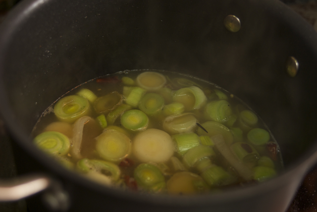 4. When leeks are transparent and soft, strain out solids (don’t strain into the sink like I have done more than once…be sure to put something underneath the sieve to catch the liquid – TH. AT’S what you’re serving, not the actual leeks!). Return liquid to clean saucepan, and return to a simmer.