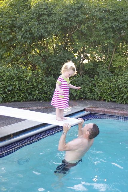 My camera has, sadly enough, had the last couple days off other than the Murphy’s baby celebration. I usually take 150 – 200 photos every day, and today I only took FIVE! Oh my god! It’s the end of the world! I was able to capture Jeffrey taking a dive off of the diving board on our first warm day of summer…he’s a brave soul – the water was only 65 degrees!!! He’s CRAZY!!! Ellie got the biggest kick out of watching the whole spectacle!