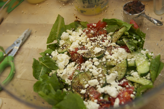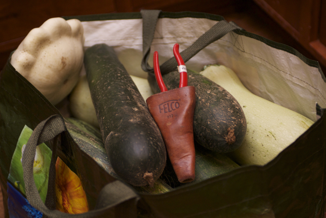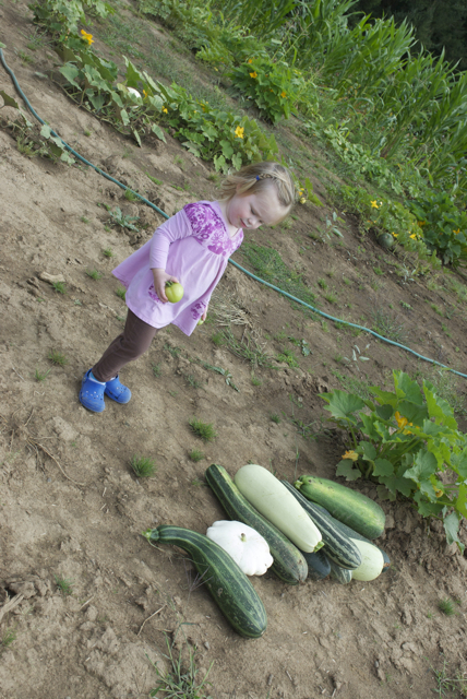 The zucchini and patty-pan squash had grown to ridiculous sizes, and there were enough cucumbers hanging on the vine to stock a produce aisle. So EG and I collected as much as we could carry, and then sent Jeffrey out to get the rest. He swears that the bag of squash weighed 90 lbs.