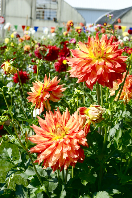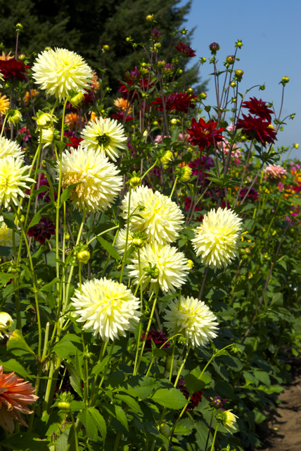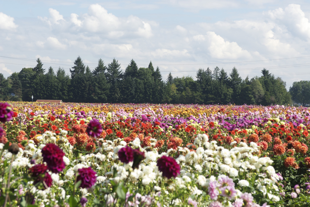 Today, however, I found myself in a little piece of heaven. Colin and Susie both love dahlias almost as much as I do, and asked me to do flowers for next week’s celebration……and they specifically asked for Dahlias. WOO HOO! It so happens that Swan Island Dahlias (America’s largest grower) is only 25 minutes from here and has great prices. So off I went to order a few white and fall color dahlias. Ok. Stop. Woah. I had NO idea there were so many different types, colors, shades, sizes, or shapes of the same flower. I drooled my way around the demonstration garden.
