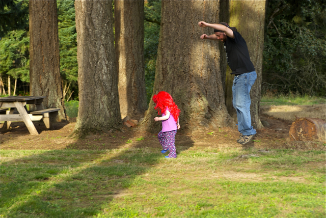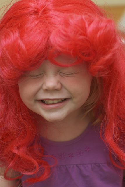 Ellie Graye was, of course, her usual theatrical, dynamic, spunky self today. I found an Ariel wig at Target, and while I didn’t think she’d wear it, I showed it to her anyway. The first time round, she wanted nothing to do with it. Later on, she saw it sitting by the door (I was going to return it), and she asked to put it on. It was absolutely hysterical. Oh, my lord. She’s such a HAM!!!!!