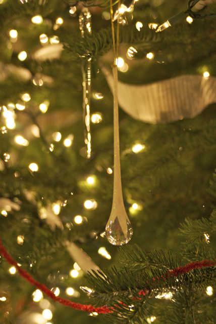 I love how he always tries to pad his “criticisms” with a reminder of how amazingly talented and incredibly creative I am. Acting huffy, I walked away – but the reality is that I knew he was right. I didn’t like the tree either, and the red ribbon I had used seemed flimsy (the word I had used yesterday with my mother when we were discussing what was missing to make the tree pop). I think the ribbon would have been great on a smaller tree, but it just got lost in such a great, big tree! A short while later, I went back to Jeffrey and asked about my glass icicles.