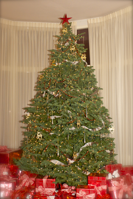 As soon as Ellie Graye was nestled into bed, out came the glass icicles, off came the flimsy red ribbon, and things seemed to be coming togehter! I couldn’t quite put my finger on what the finishing touch was, so I shifted gears and started tackling gift wrapping. As I went through the piles of ribbon spools, I happened upon the PERFECT ribbon for the tree. And voila! Everything is just right! Phew.