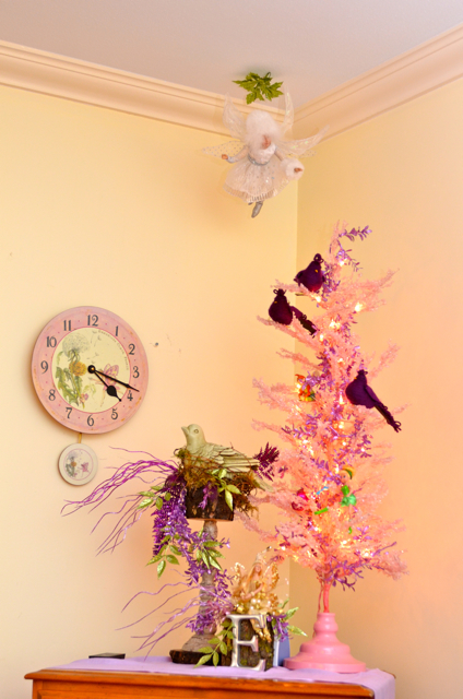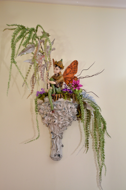 My favorite Fairy. I bought him years ago in Bend (before I moved to Oregon). The shelf I got on clearance for $3.00 at Marshalls. "Greenery was all on clearance too. Didn't pay more than $.59 a stem!