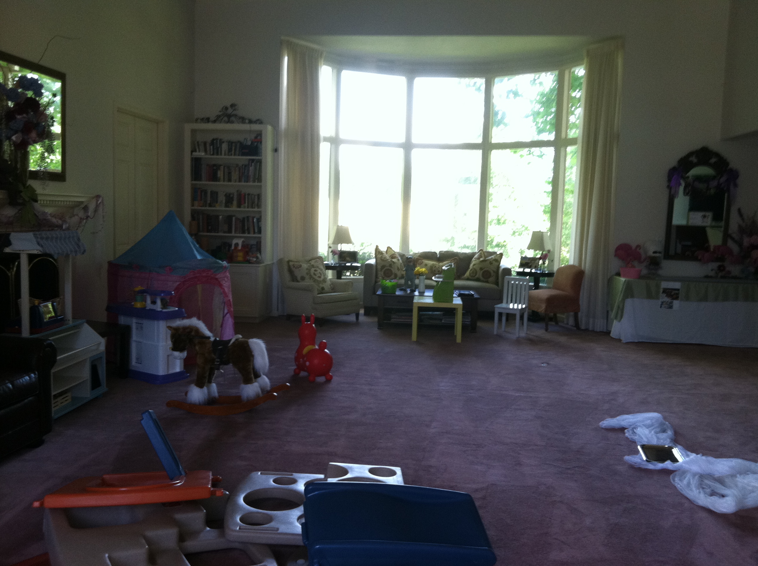 BLESSING IN DISGUISE: We had an amazing turn out, with between 70 and 80 people (including little ones) roaming about. Friday was an absolute panic day, and I have to admit, I broke down. Living in Oregon, with its insanely wet weather, I usually have a Plan B for anything planned outside. But the track record for our parties in July was impeccable, and I hadn’t even thought about the “what if it rains” scenario! We were having a pool party, damn it! As the party date grew closer, rain was becoming eminently imminent. With a phone call at dinner time on Thursday asking, “What’s plan-B?” I just about lost it! What WAS Plan-B? Every weather report called for rain…and not just a chance of showers – a 71% chance of showers. My decor was all planned for outside, the serving tables were planned for outside, and the kids were supposed to SWIM! There was no way around it: the living room had to be turned into a play room. Sofas got pushed against the walls, folding tables were set up inside, every single one of Ellie’s toys were piled around the perimeter, and I found myself planning additional decor at the last minute. As things started to come together, I realized that the set up worked even better than what I had planned even if the weather was GREAT! We were finally utilizing the amazing space that we have, and on top of that, I could set up the night before rather than getting up at the crack of dawn! My mother stepped up and offered to do an art tent for an activity, and boy was that a hit!