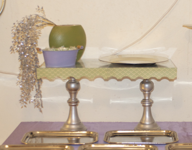 Cake stand: candle sticks, metallic spray paint, shelf glass, and scrapbook paper; Vase: Green (Eden) spray paint and $1 vase from TJ Maxx (was eventually filled with flowers); Candy Tin: $1 tin from Target, purple spray paint