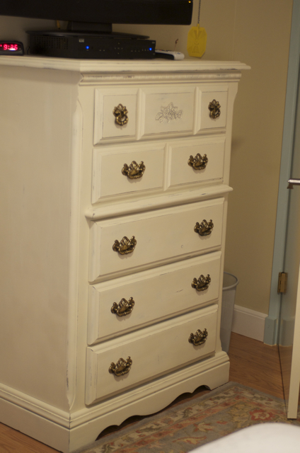 I'm still searching for handles for this dresser. I bought it at a garage sale for $5. It was an incredibly dark stain (to match the handles)...the paint is a step in the right direction