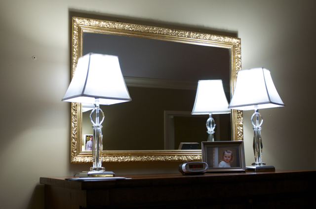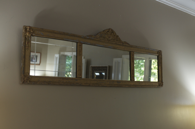 Recently, I found a cool gold framed mirror at the Goodwill ($14.99); it’s a strong enough piece that it balances out the robustness of the large dresser.