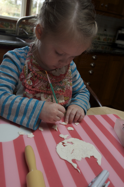 As I dive in to prepping for our “Simple” Easter Party, Ellie is right by my side. “I can help ya!” she repeats over and over. So yesterday, that’s what she did. First we made a small batch of sugar cookies (I’ll make another batch after she heads to school today), and while she painted on the royal icing, I broke out the Gum Paste and started to work on the flowers that will top the cake. She had some fun with her own gum paste as well, and was eager to learn some of the techniques that I pretend to know.