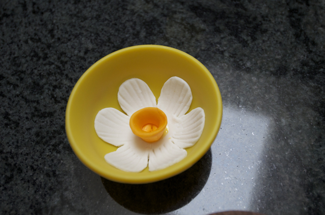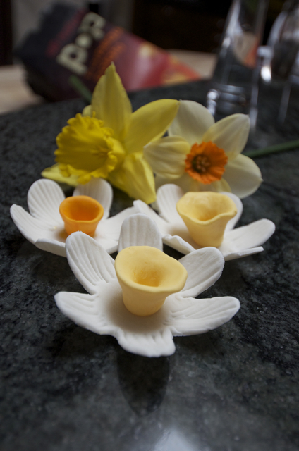 The flowers themselves are actually fairly easy to make, but make a pretty impressive display once finished and painted with food coloring (which I have yet to do). I used a Wilton flower cookie cutter for the basic shape, using the handle end of a paintbrush to add ridges. The cup is pretty self-explanatory. I started with a small ball, then shaped it into a tear drop and used the end of a larger paintbrush to hollow out the center. I let them dry in small pinch prep bowls, and voila. Daffodils. Next up, the stems.