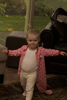 Ellie Graye was, as usual, non-stop. She’s constantly moving, constantly learning, and constantly full of energy! She’s got so much personality! Her “thing” today revolved around her pajamas: yes, her pjs. She decided that she wanted to wear them like a cape – arms only, no feet! It was a riot. The entire day she wore her pjs like that, sometimes holding the feet in her hands, other times letting them drag behind her like a second set of legs. It really was comical to see.