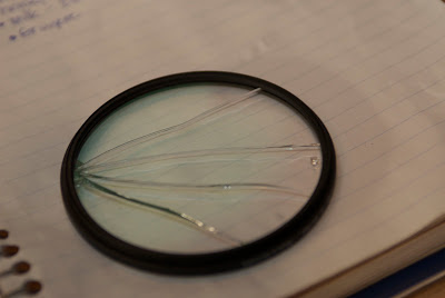 Friday morning, as I drove over to the old barn, I stopped to take pictures of the lake. Everything seemed fine…until I looked at the photos. There was an odd white blurry area in the same place on all of the shots. When I looked at the lens, I expected to see lint or a smudge or something that would simply need a cleaning. What I saw instead was broken glass.