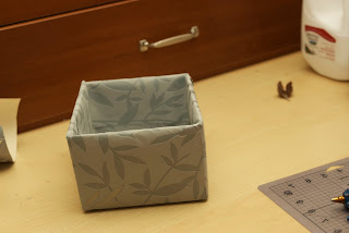 I covered a box with wallpaper I had found on clearance somewhere a while ago, and then wrapped it up in cellophane. I was pretty happy with how it turned out.